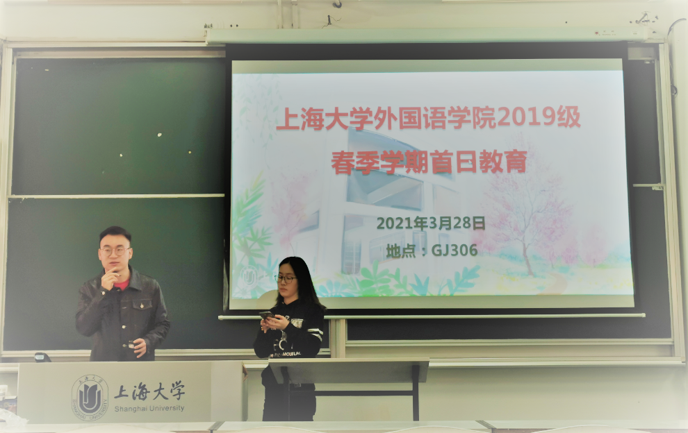 3月28日上午9点,外国语学院2019级2020-2021学年春季学期首日教育在宝山校区GJ306顺利举行。2019级英语系和日语系全体成员准时参加了本次教育活动,活动由英语2班汤静怡同学主持。