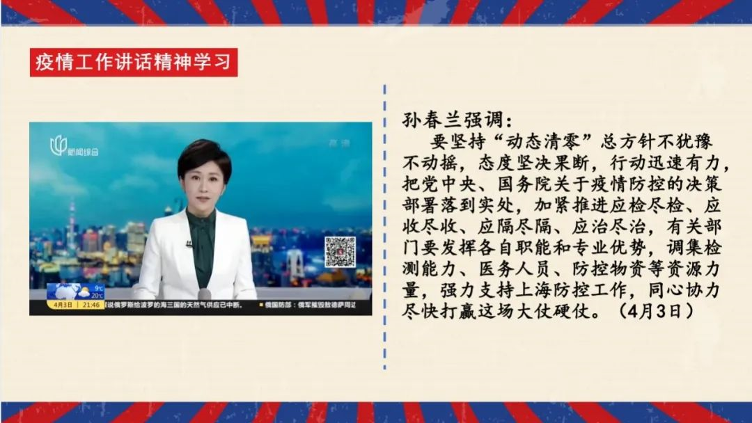 第二个部分是“学习战疫相关文件精神”。首先,同学们一起学习了国务院副总理孙春兰和上海市委书记李强在疫情工作中的讲话内容,进一步明确了此次上海抗疫工作的要点和核心方针。其次,在疫情防控的攻坚时刻,在校内的同学应积极响应国家和学校的动员令,争做校园疫情防控的“自律派”、“行动派”、“技术派”和“表达派”,校外的同学们应争做社区志愿服务的“先锋派”,争做抗击病毒的“乐观派”。