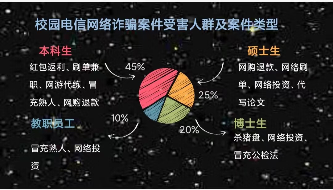 宣讲伊始,陆警官给同学们分析了校园电信网络诈骗受害人群特点及案例类型。陆警官特别提到,初入社会的大学生们常常会成为网络诈骗的目标对象。同学们通过这一部分的内容也对网络诈骗有了更深入的了解。