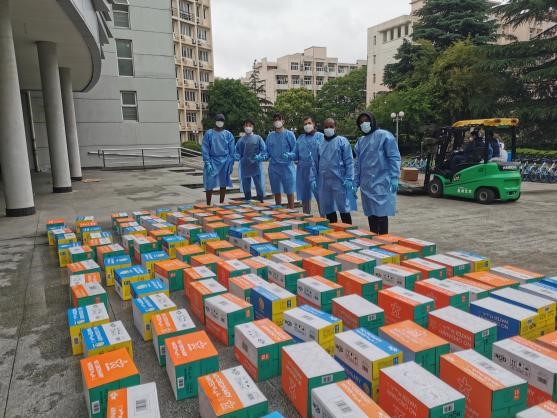 5月24日,多批物资有序进入校园后,学院第一时间组织师生志愿者进行物资整理和搬运,确保爱心物资安心、迅速地送达在校师生手中。外国语学院院长尚新、学院党委副书记、副院长贾小琴以及留校教师共同搬运物资,并组织志愿者负责物资发放到楼,再由各楼有序安排学生前往领取。
