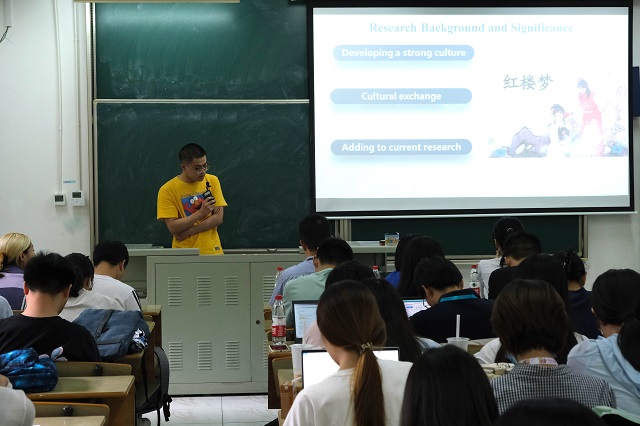 第一位主讲人为2020级博士生李小华。李同学的题目是国内多模态翻译研究的可视化分析:现状、问题及建议,选题十分新颖。他通过多重数据分析与文献信息搜寻,对多模态翻译进行定义、分析、举例说明等,他认为多模态翻译即为实现意义重构的跨模态转换活动。通俗来讲,文字转化为图片、纯文字小说译成图文结合绘本等诸如此类即为多模态翻译。他言语缜密,角度新奇,提高了广大同学对多模态翻译的认知理解程度。第二位主讲人为2019级本科生苏钰。苏同学在新时代背景下提出了“英语‘拆墙’理论下的高校创新人才培养”问题。她以钱伟长老校长的“拆墙”教育理念为基础,探索了外语学科的内在属性和外部环境,提出结论:外院人才应该提升自己的科学素养、信息素养和科普知识,以国家需要出发,培养国际视野,建立文化自信,如此才能成为新时代复合型跨学科创新人才。第三位主讲人为2021级研究生吴金铭。吴同学就“《红楼梦》金陵判词英译文对比研究——以霍译和杨译为例”选题做了精彩讲演。《红楼梦》作为中国四大名著之一,多维度呈现了中华文化风貌,包括文字、艺术、宗教、服装等。吴同学主要通过修辞手法与翻译策略两方面对《红楼梦》霍克斯译本和杨宪益译本进行比较。其中他选取了用典(咏絮才)、双关(玉带林)、暗喻(霁月难逢,彩云易散)的修辞翻译,以及归化异化的翻译策略比较两种译本。第四位主讲人为2021级研究生赵金如。赵同学的专业选题“专有名词音译中英汉音系对应的处理问题研究”案例丰富、贴合实际。他自主发现了问题:音译的标准是什么?并探究了音译背后的三个问题,中英文音系的异同、音译的准则、以及什么是翻译实践中的关键点。最终得出结论,音译时应掌握正确的发音和基础语音知识,明确中英文的语音异同,了解音译背后的文化社会背景(如方言等因素)。