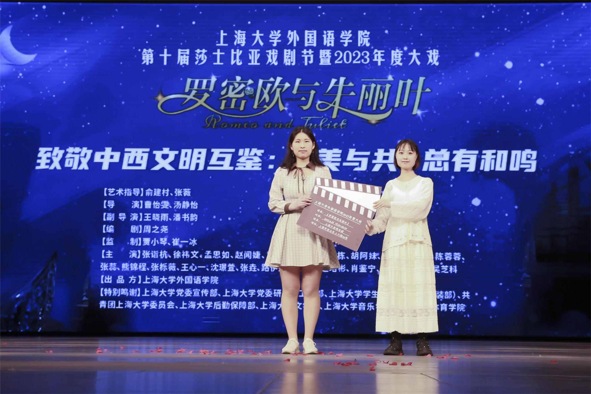 5月26日晚,上海大学第十届莎士比亚戏剧节暨外国语学院2023年度大戏《罗密欧与朱丽叶》在伟长楼成功展演。今年,在全党深入开展学习贯彻习近平新时代中国特色社会主义思想主题教育的大背景下,莎士比亚戏剧节旨在充分发挥学生主观能动性,鼓励学生自编、自导、自演,把书本知识转化为学生们亲身的文化认知体验,传播中华文明,坚定文化自信,学习莎翁经典,促进中外文化互鉴。上海大学莎士比亚戏剧节已经发展成为独具外语特色的校园文化品牌和众多校友美好的上大记忆。