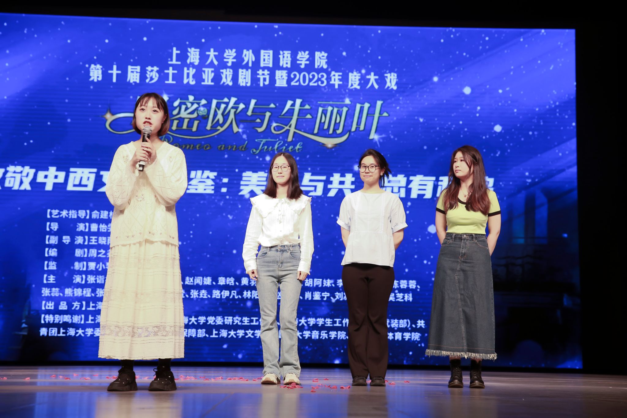 随后,大戏学生团队导演组上台并逐一发表了感言。总导演曹怡雯同学对学校、学院的大力支持表示感谢,对所有演员与工作人员表达最高的敬意;导演汤静怡表示本次大戏经历对她意义非凡,并表达了对于戏剧执着的热爱。