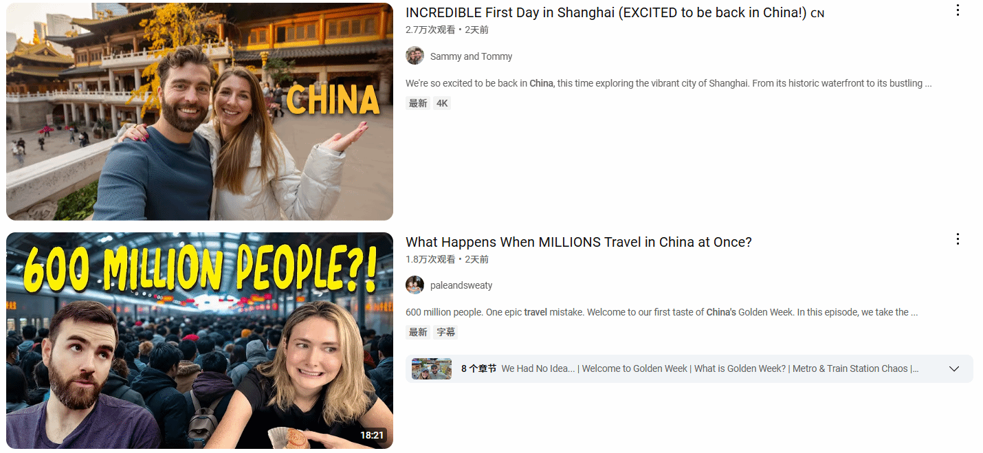 国家移民管理局聚焦推进更高水平对外开放,自13年起持续推出一系列过境免签政策,在24年年末,国家移民管理局发布了全面放宽优化外国人过境免签政策,将停留时间延长为240h,从入境游转换为深度游。与此同时,外国游客在中国的旅行见闻频频登上海外社交媒体,成为国际网友热议的话题。伴随视频的全球化传播,越来越多的外国博主通过影像记录中国的城市风貌、人文风情和社会发展,展现了一幅生动立体的中国旅游图景。数据显示,关于“中国旅行(China travel)”的话题热度已突破10亿流量,外国游客在相关社交媒体上的中国旅行视频播放量累计超过2300万次,成为国际观众了解中国的重要窗口。