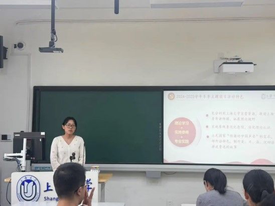 随后,曾两度获评上海大学“十佳活力团支部”的2023级外国语言文学班团支书戴雅宁同学带来了干货满满的经验分享。在介绍2024-2025学年冬季主题团日活动时,戴雅宁同学分享,她采用了“理论学习+实地参观+专业实践”的创新模式。借助上海大学的丰富资源,邀请青年讲师团开展理论讲座,拓宽同学们的视野;组织同学们实地参观鲁迅纪念馆,让大家在沉浸式体验中深化对理论知识的理解;结合支部的外语专业特色,制作英、日、法、汉四语视频讲述鲁迅的故事。戴雅宁同学提到,在制作过程中,支部成员充分发挥个人专长,分工明确,从文案写作、摄影记录,到视频剪辑、四语朗读,每个环节都精益求精。并且,他们还根据不同语言的表达习惯,精心调整视频的节奏与呈现方式,结合外国友人的建议和社交媒体的数据反馈,不断优化视频内容,成功打造出具有支部特色的品牌活动,赢得了现场阵阵掌声。
