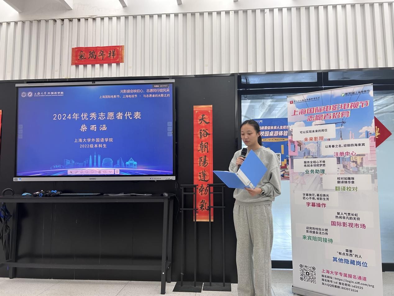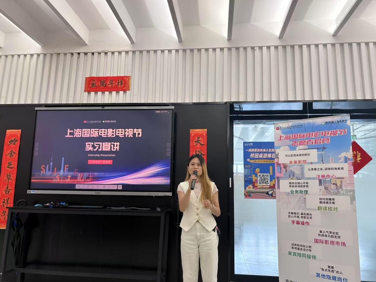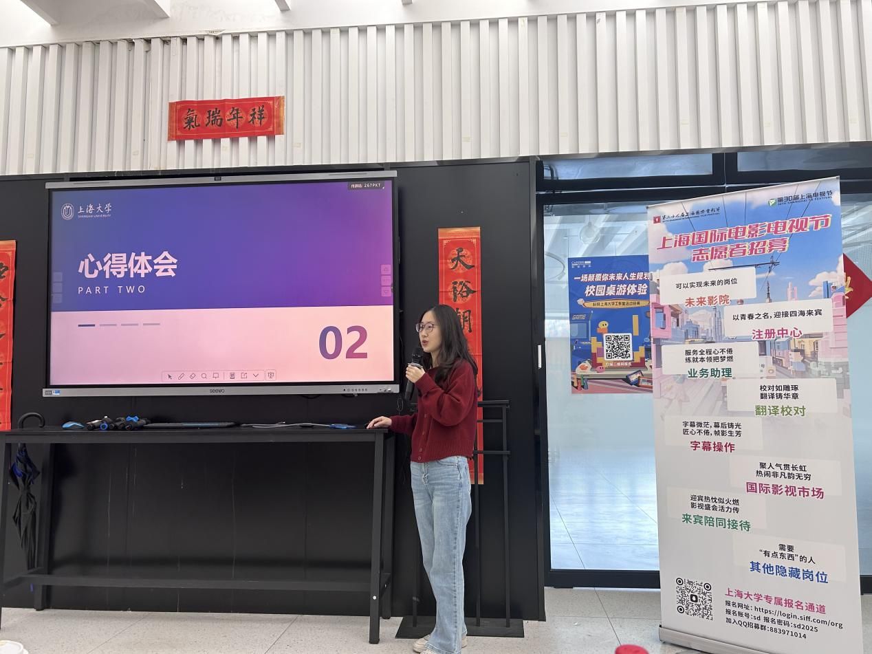 2025年4月17日,第27届上海国际电影节、第30届上海电视节上海大学志愿者宣讲会暨志愿项目启动仪式在上海大学宝山校区南区创新创业实践基地310多功能会议室隆重举行,由外国语学院2024级硕士研究生夏彧主持。上海国际影视节中心经管部主管戴昱妍、上海大学团委副书记姜晓庆、校团委团干部张真真、外国语学院团委书记马思涵等嘉宾出席,与上大志愿者共同见证这一光影与青春交织的盛会。