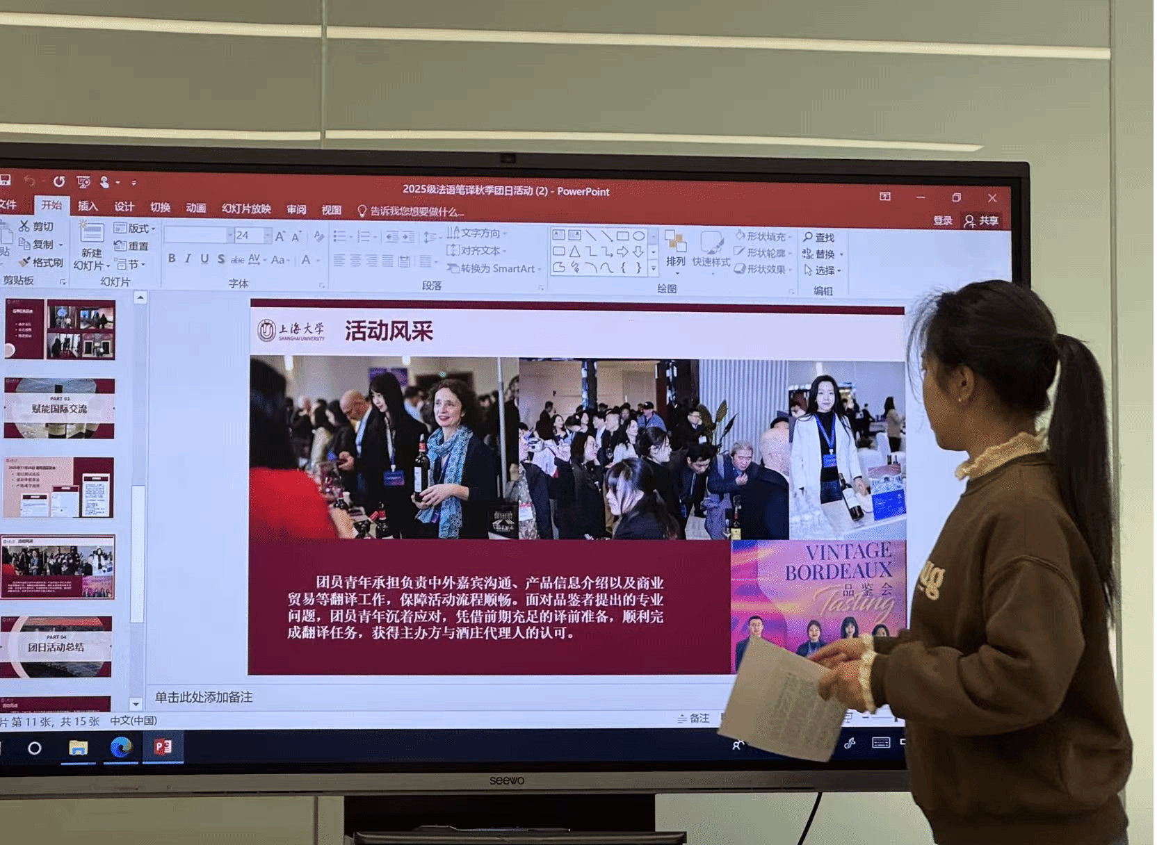 12位团支部书记围绕策划思路、实施过程、特色亮点与育人成效等内容进行了精彩陈述。答辩内容紧扣外语专业特色,涵盖“双语理论宣讲”“跨文化志愿服务”“专业实践赋能”“多语种文化交流”等多元形式,展现了各支部立足语言专业、贴近青年学子、注重实践实效的活动风貌,彰显了外语学子的语言素养与国际视野,更体现出基层团组织的活力与创造力。