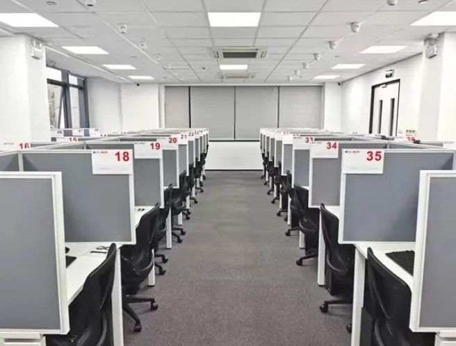 从电梯上到三楼,走出电梯到考点301房间,门外走廊上有供考生临时等候的长椅,走进考点大厅,地面通铺有地毯,走动或挪动桌椅不会有噪音,迎面是前台,左边一面墙为储物柜,右边口试等候区安置有座椅。考生进场前,监考老师提供贴心服务,提醒考生去卫生间、摘下所有饰品和电子设备、手机关机,将个人物品存包,然后去检录。检录后,考生在工作人员的引导下,前往机考笔试房间,或是在口试等候区稍加等待。