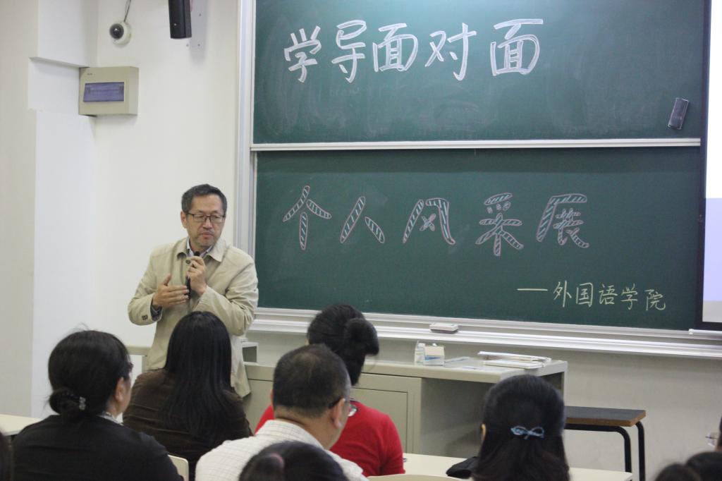 活动伊始,唐青叶教授向各位同学介绍英语系学导制开展情况,她从学导制起源于英国牛津大学引入话题,分析了我院学导制建设“制度化、机制化、规范化”的特色,再从对学导要求、指导内容、约见方式、对学生要求四方面展开,强调学导应在学生专业能力、情感生活、人生规划等方面给予指导帮助,学生应积极主动地与导师进行每月至少一次的沟通交流。紧接着,赵莹波教授重点介绍了日语系学导制对学生未来发展的益处并提出了加强导师与学生生活上沟通的希冀。