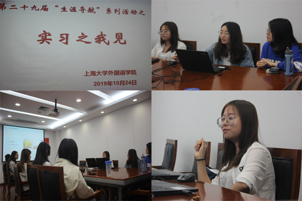 10月24日18:30,外国语学院“实习之我见”优秀学长交流会在宝山校区C512会议室如期举办。本次活动邀请了我院优秀研究生代表夏梦蝶和本科生代表金滢洁两位同学进行分享,旨在指导我院低年级学生了解实习内容、提前进行自我分析并制定和完善实习规划,从而为将来就业打下基础。