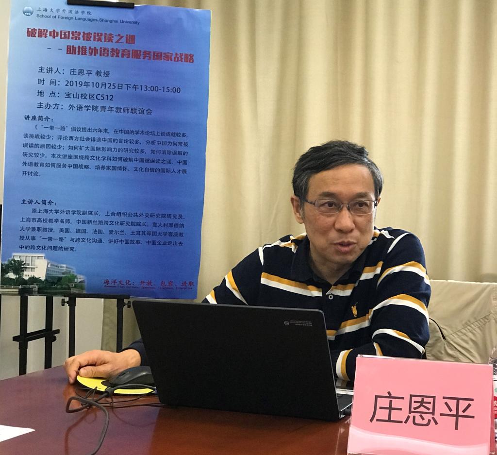 10月25日下午,庄恩平教授在上海大学校本部C512会议室开展了题为“破解中国常被误读之谜-助推外语教育服务国家战略”的讲座。讲座由外国语学院青联会会长虞怡达老师主持,外语、中欧、悉商学院近五十位师生到场参与研讨。
