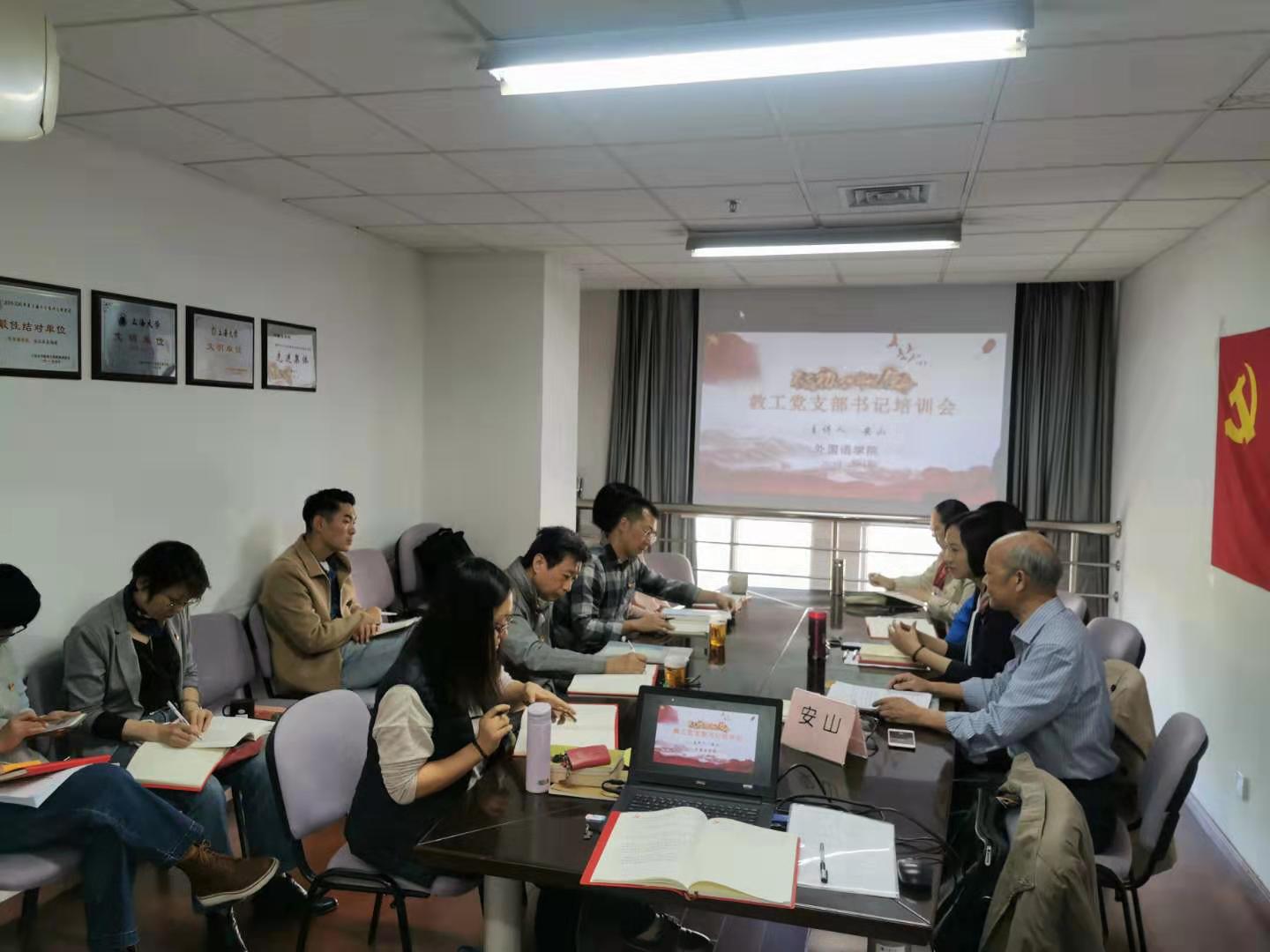 2019年11月1日上午9时,外国语学院在校本部C302会议室举办“不忘初心,牢记使命”主题教育之教工支部书记工作实务培训。本次实务培训由外国语学院特邀党建组织员安山老师主讲,外国语学院党委主持工作副书记曾桂娥、党委副书记贾小琴、英语系党总支书记陈秀猛以及教工各支部书记、部分支委、研究生专职委员马思涵和学生第一党支部书记崔一冰也列席参加了本次培训。