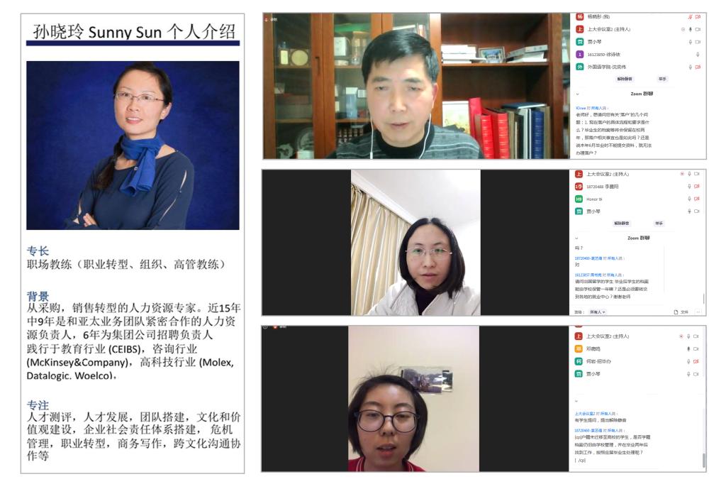 为关心毕业生身心健康和帮助疫情下毕业生解决就业难题,3月6日19:30,外国语学院以“新形势下的就业问题”为主题的空中德育课堂在zoom会议平台顺利开讲。本次德育课堂特邀上海大学招生与就业办公室副主任傅新华老师、何岩老师、法学院党委副书记王国正老师以及企业人力资源专家孙晓玲女士出席研讨,外国语学院党委副书记贾小琴老师、就业联络人梁苗老师、研究生专职委员马思涵老师和本科生就业助管员团队以及部分学院毕业生共同参加了本次线上课堂活动。本次交流由贾小琴老师主持。
