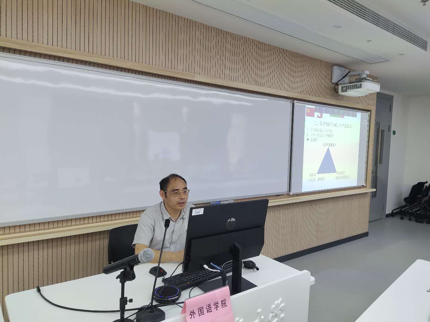 7月31日,外国语学院“四史”外语党课学习会在校本部B316召开,通过线上、线下相结合的方式,全院师生党员、积极分子参加了本次学习。学院党委书记邓志勇、副书记贾小琴、副院长戴朝晖、英语系党总支书记陈秀猛、党委委员兼工会主席张建琴,以及教工党支部书记、行政支部党员线下参会。本次学习会由贾小琴主持。