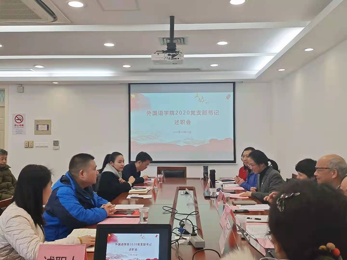 12月25日下午1:30,外国语学院党支部书记述职会在校本部C512会议室召开。上海大学特邀党建组织员安山,上海大学教师工作部副部长孙琦琰,上海大学研究生工作部副主管胡晨,上海大学学生工作部思政科白晓东,外国语学院党委书记邓志勇,学院党委委员、院工会主席张建琴,学院党委委员、英语系党总支书记陈秀猛作为评委出席了本次述职会。学院教职工、研究生、本科生共13位党支部书记参与述职。述职会由学院党委副书记贾小琴主持。