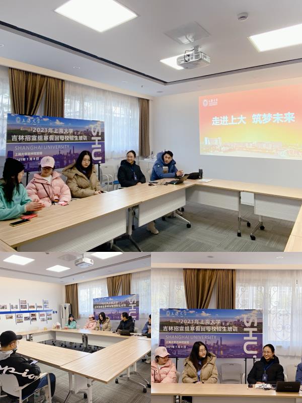 1月8日下午2点,上海大学吉林招宣组在宝山校区“临泮轩”B104会议室举办2021年寒假回母校宣讲第二次培训。吉林招宣组副组长、外国语学院党委副书记贾小琴,吉林招宣组联络人崔一冰以及来自社区学院、美术学院和法学院的8名本科生出席了本次培训活动。