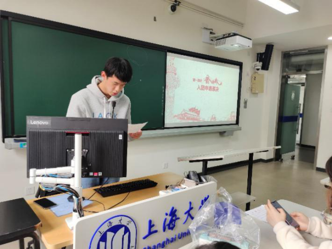 在“入团申请表决”这一环节,英语系陈爵伦、金思远,日语系王雨霏,法语系倪如萍四位同学依次宣读了入团申请书。几位同学言辞恳切,希望加入中国共青团贡献自己的力量。团员同学们感受到他们的诚心,纷纷举手表决,同意他们加入中国共青团。