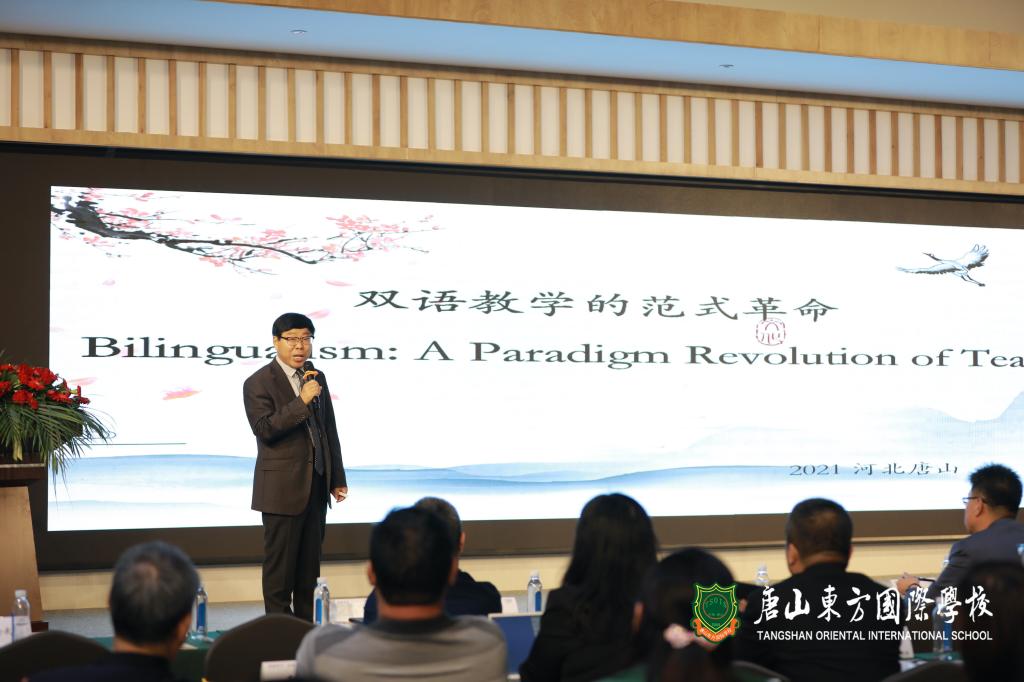 5月30日,由唐山市教育局、国际学校在线联合主办,唐山东方国际教育集团协办,唐山东方国际学校承办,中国先秦史学会国学双语研究会、上海大学外国语学院、长春师范大学国际教师教育学院指导的国韵东方·经典传承——国学双语课程发展高峰论坛在河北唐山隆重召开。来自全国各地200余位知名专家、校长和教育工作者齐聚一堂,共同围绕国学双语课程的创新、实践及未来发展进行主题分享和互动交流。全国政协委员、国家督学、中国民办教育协会会长刘林,唐山市委教育工委书记、唐山市教育局党组书记、局长刘绍辉,中国教育发展战略学会副会长兼学术委员常委周满生,长春师范大学副校长杨勇出席本次会议。外国语学院院长尚新、党委副书记贾小琴以及赵彦春国学双语研究团队受邀参会,外国语学院赵彦春教授作为特邀嘉宾在本次会议上做了题为“双语教学的范式革命”的主旨演讲。