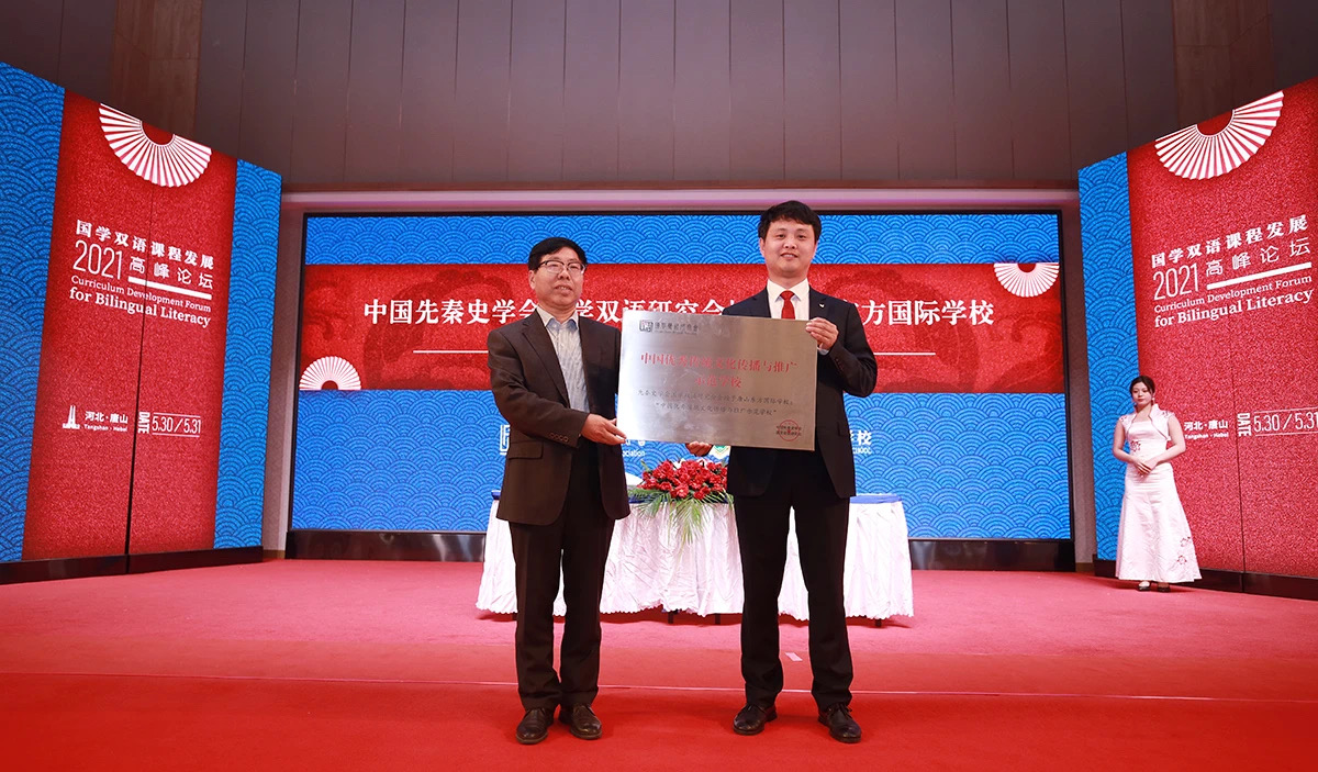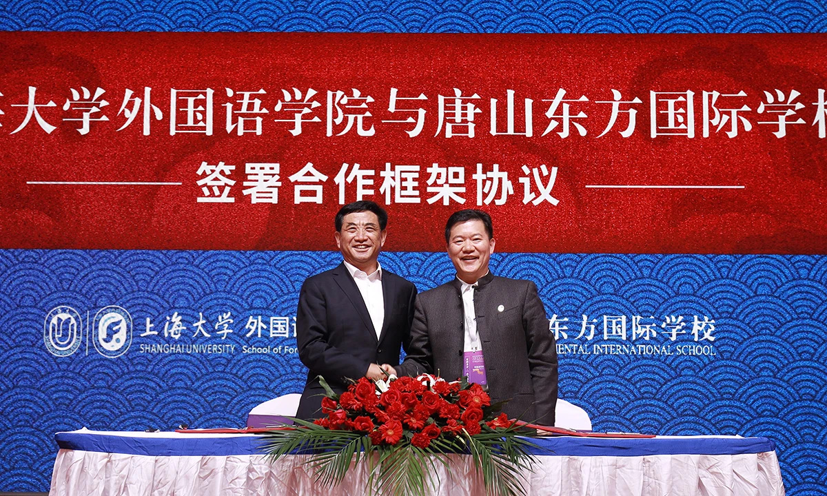 上海大学外国语学院赵彦春国学双语研究团队在国学双语教育领域进行了前瞻性的探索。团队挖掘中国文化的深刻内涵,对教材开发、课程设计进行了深入的研究。在此基础上,团队与唐山东方国际学校就教材使用、课程推广等方面达成一致,尚新院长代表上海大学外国语学院与唐山东方国际教育集团签订合作框架协议,赵彦春教授作为中国先秦史学会国学双语研究会执行会长为唐山东方国际学校举行授牌仪式,授予其“中国传统文化传播示范校”殊荣,今后各方将就国学双语课程体系的建立与开发进行深入合作,共同致力于中华优秀传统文化的继承与传播。