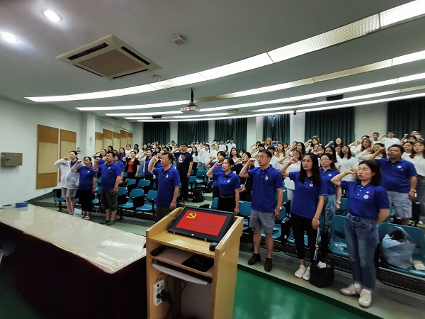 7月1日上午8时,外国语学院百余名党员师生齐聚校本部J101教室,共同观看庆祝中国共产党成立100周年大会,共同聆听习近平总书记发表的七一重要讲话,并重温入党誓词。