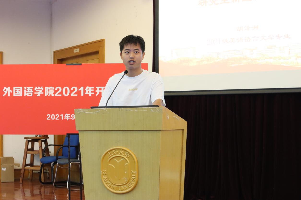 典礼在全体师生齐唱国歌后拉开序幕。尚新院长首先代表学院向2021级全体新生表示热烈欢迎,并发表“回顾历史,彰显精神,立志报国,自强不息”主旨演讲,分享了上大和学院的历史沿革,以及上海和上大的精神。院长深情讲述上海大学作为红色学府的独特历史和知名校友在上大的故事,带领新生一起了解上大外院的前身——1923年成立的英国文学系;精彩的演讲让新生们真切感受到上海城市“海纳百川、追求卓越、开明睿智、大气谦和”的精神和上海大学开放包容、追求卓越的校园氛围。院长祝福所有新生:“愿各位同学求学上大,人人能青春无悔,成为强国有我的栋梁之才。”