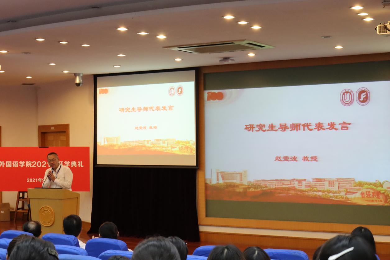 随后,本科生导师代表王骞老师和研究生导师代表赵莹波老师上台致新生寄语。王骞老师从学生的角度出发,字字箴言又不乏幽默,提出“学习是王道,健康是基础,爱好是调剂”的建议,鼓励同学们提高综合素质。赵莹波老师古今、中日诗词交错、生动讲述了他作为“上大人”三十多年的学习生活、工作经历,希望同学们能畅游书海,“登顶宝山之巅”,回馈社会,养成“外语+”的特色人才。