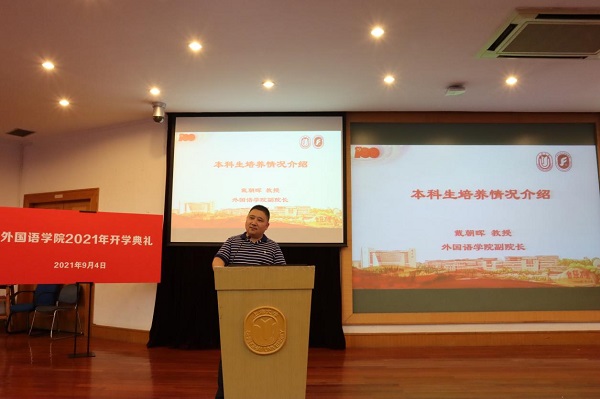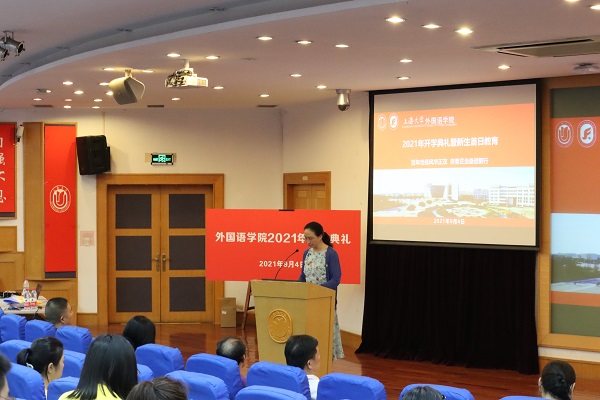 9月4日13:00,外国语学院2021年开学典礼在校本部J202如期举行。外国语学院党委书记邓志勇教授、院长尚新教授、党委副书记贾小琴老师、副院长戴朝晖副教授、唐青叶教授、英语系主任张新玲教授、日语系主任赵莹波教授、英语系导师代表王骞老师、日语系导师代表文雪老师、张晓娜老师、本科生辅导员梁苗老师、研究生辅导员马思涵老师和曹若兰老师以及2021级全体新生共同参加了本次开学典礼。本次典礼由学院党委副书记贾小琴老师主持。