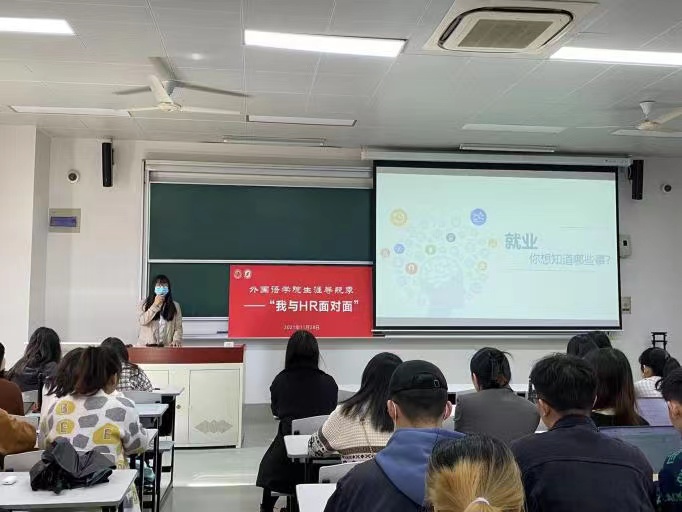 11月28日上午在宝山校区BJ203教室,外国语学院邀请了名企资深HR翦经理,开展“就业你想知道哪些事?”为主题的讲座。外国语学院2021级研究生和2018级本科生共同参加。讲座由研究生辅导员马思涵老师主持。