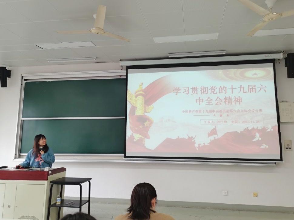 柯宇铮同学带领大家集中学习了党的十九届六中全会公报,并分享了自己的学习体会。与会老师同学纷纷结合自身思想情况和学习工作实际进行交流,认为十九届六中全会总结凝练了一百年来党领导人民进行伟大奋斗积累的宝贵历史经验,同时前瞻性地指出了一张蓝图绘到底的新的百年奋斗遵循,是“两个一百年”历史交汇点上交出的一份重磅“百年总结”。大家表示要进一步认真学习贯彻党的十九届六中全会精神,全面系统学习领会全会精神的丰富内涵与核心要义,坚定理想信念,发扬奋斗精神,以更加昂扬的姿态迈进新征程、建功新时代。