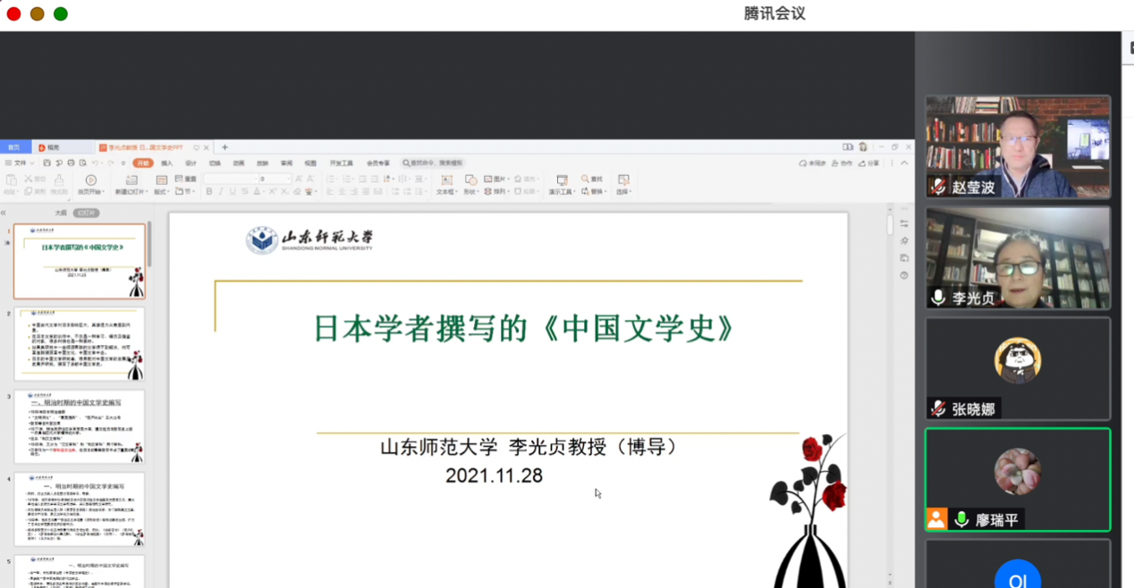 11月28日晚,外国语学院日语系、英语系120余名师生在线聆听了山东师范大学外国语学院日语系主任李光贞教授为我们开设的题为“日本学者撰写的《中国文学史》”的讲座。本次讲座是日本龟甲万公司提供的“MURASAKI紫”奖学金高端学术讲座的第十三讲,由日语系主任赵莹波教授主持。