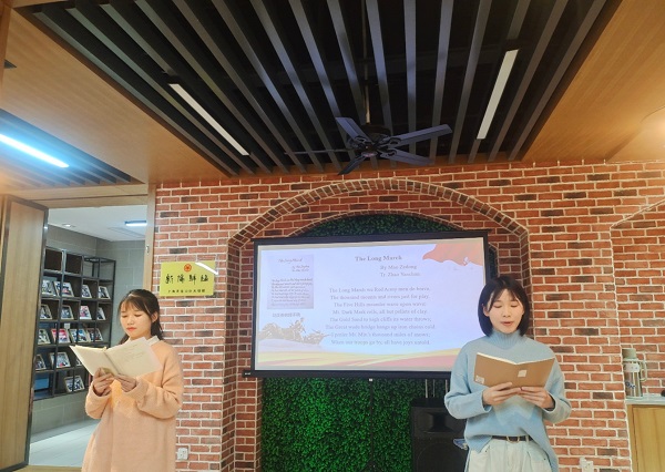 首先,讲解员带领大家参观大场镇社区党群服务中心,体验“微·光”沉浸式情景党课,细致地介绍了长征故事,让大家感受到党百年历史的波澜壮阔。在参观完大场镇社区党群服务中心后,赵彦春教授为大家解析《七律·长征》英译版本,《七律·长征》句式标准,格律严密,译文也是韵律和谐,气势磅礴。赵老师还介绍了诗歌英译的翻译策略,即译者应当结合自身意识及诗学形态对翻译进行一定改写,同时着眼韵律,方能创作出好的译文。随后,外国语学院红色学讲团成员鲁冰冰和王颖华同学朗诵了英译版本《七律·长征》,从中大家感受到了伟大的长征精神,长征是人类历史上的伟大壮举,是党领导人民在百年伟大奋斗历程中孕育形成的先进思想结晶。