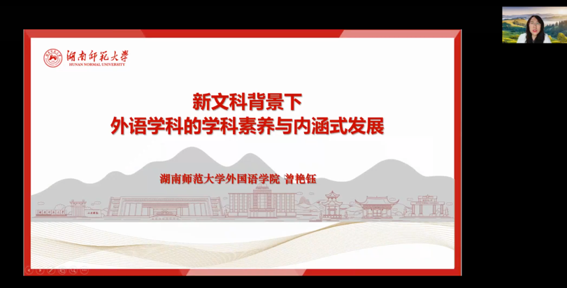 12月23日晚7点,应上海大学外国语学院邀请,湖南师范大学外国语学院院长曾艳钰教授于线上开设“新文科背景下外语学科的学科素养与内涵式发展”专题讲座。本次讲座由上海大学外国语学院院长尚新教授主持。来自上海大学、北京外国语大学、上海外国语大学、山东大学、西安外国语大学、周口师范学院、玉林师范学院、巢湖学院等多所高校的130余名师生参加本次讲座。