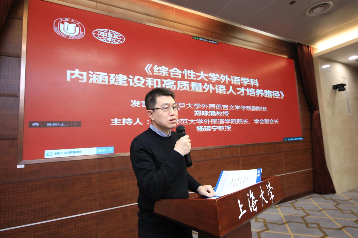 图15 上海市外文学会常务理事、上海大学外国语学院院长尚新教授做交流发言