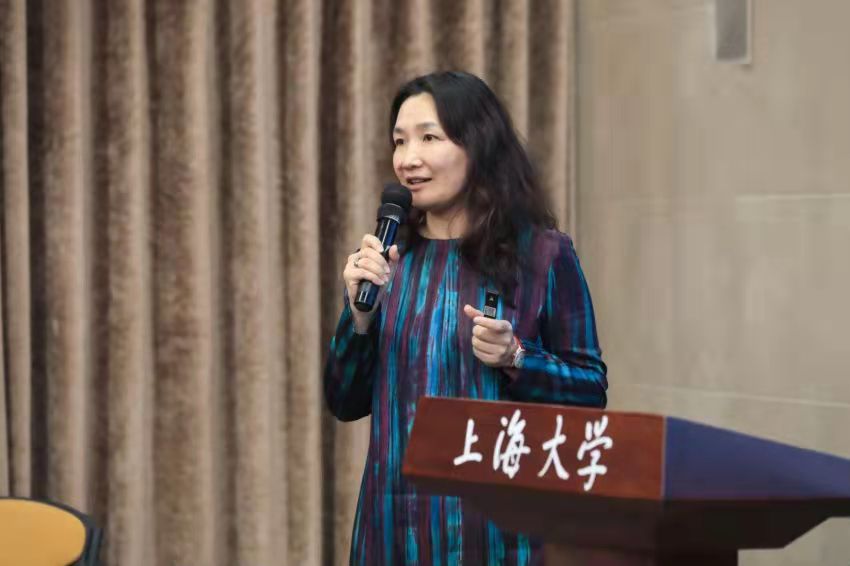 图14 上海市外文学会常务理事、复旦大学外国语言文学学院副院长郑咏滟教授做交流发言