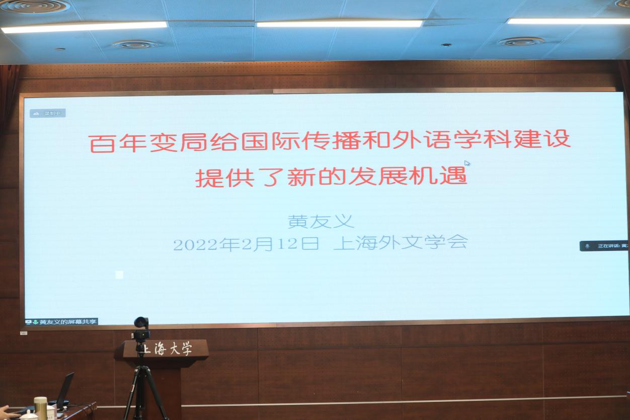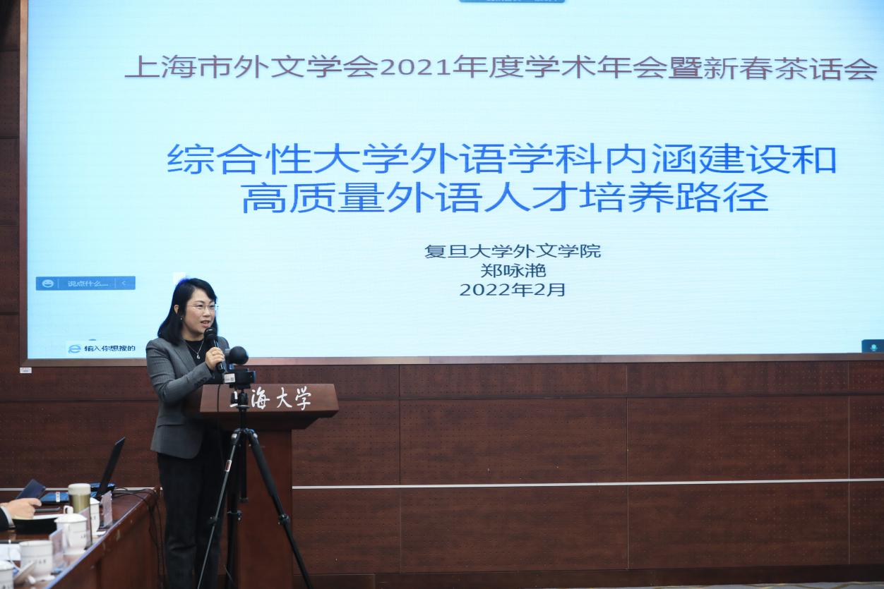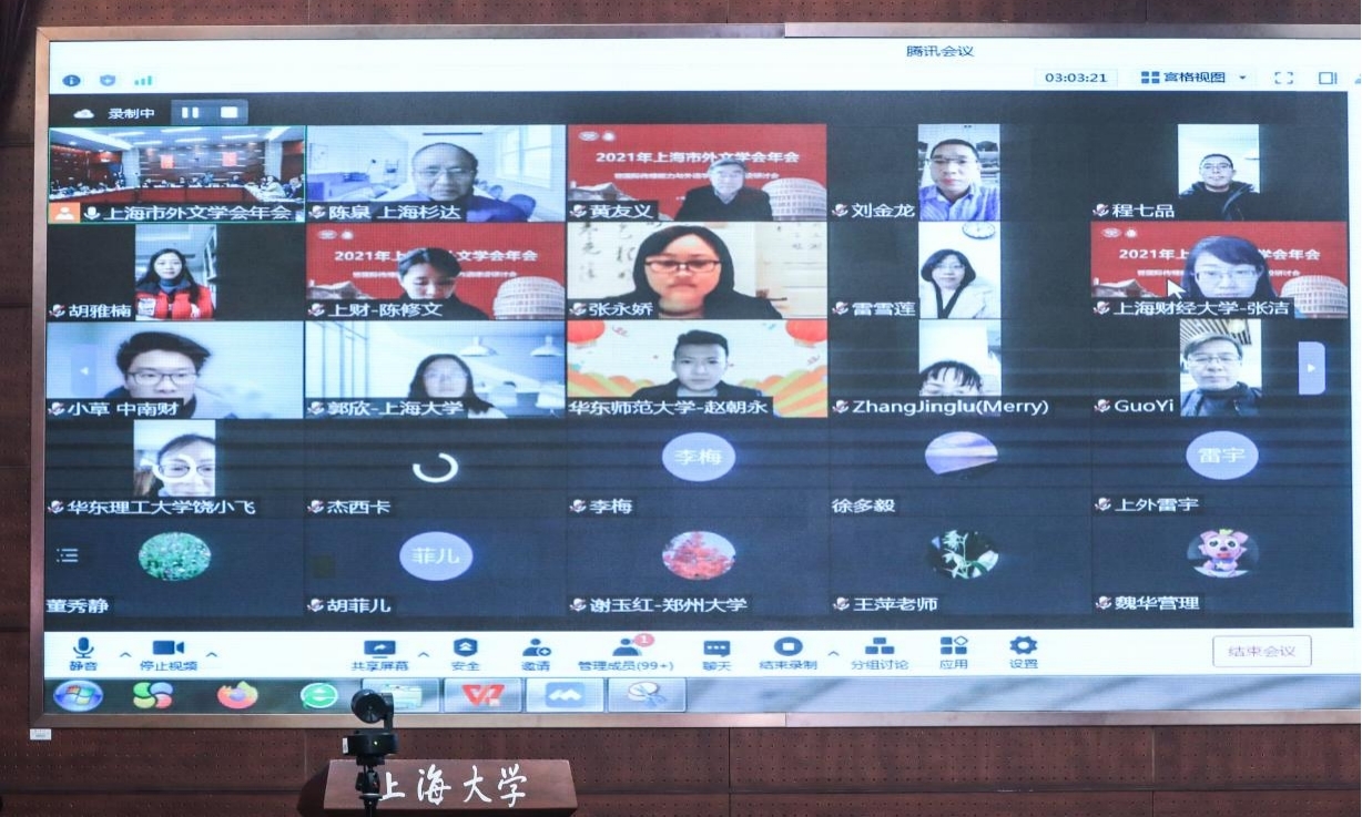 2022年2月12日,2021年上海市外文学会年会暨国际传播能力与外语学科内涵建设研讨会在上海大学成功举办(2021年学会年会因疫情原因延期举办)。本次年会由上海市外文学会主办,上海大学外国语学院承办,华东师范大学出版社和中国日报社21世纪英语教育传媒协办。来自复旦大学、上海交通大学、同济大学、华东师范大学、上海外国语大学、上海大学、华东理工大学、上海理工大学、上海对外经贸大学等上海市23所高校的40余名专家学者齐聚一堂,250余名专家学者线上参会,就“国际传播能力与外语学科内涵建设”主题展开了深入研讨,共谋百年未有之大变局下外语学科的发展。