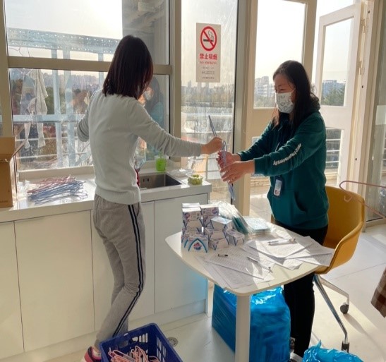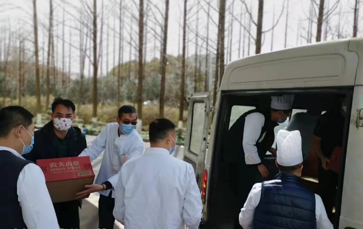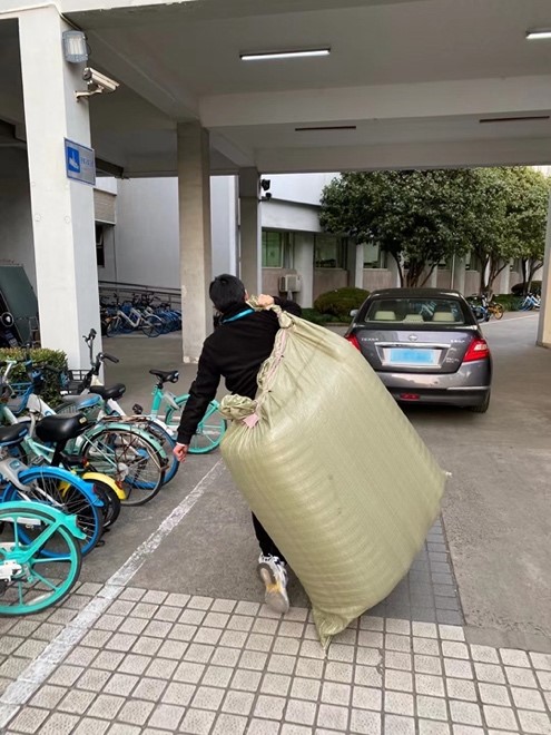 学院的男老师为数不多,却主动承担起了运送物资的重任, 推着小推车甚至徒手一遍遍运送床垫、晾衣架、瓶装水等物资,为学院提供坚强有力的后勤保障。有些老师也做起了志愿者,为集中健康观察的师生送餐送水。