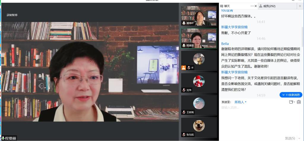 在互动研讨环节,程教授对来自各高校师生的问题做了了精彩的回应,唐青叶教授高度赞扬了此次学术讲座,与会师生对此次学术讲座的深度和意义给予高度评价。此次讲座对外语学科利用多语种和国别区域研究优势服务国家战略具有方法论的指导意义。