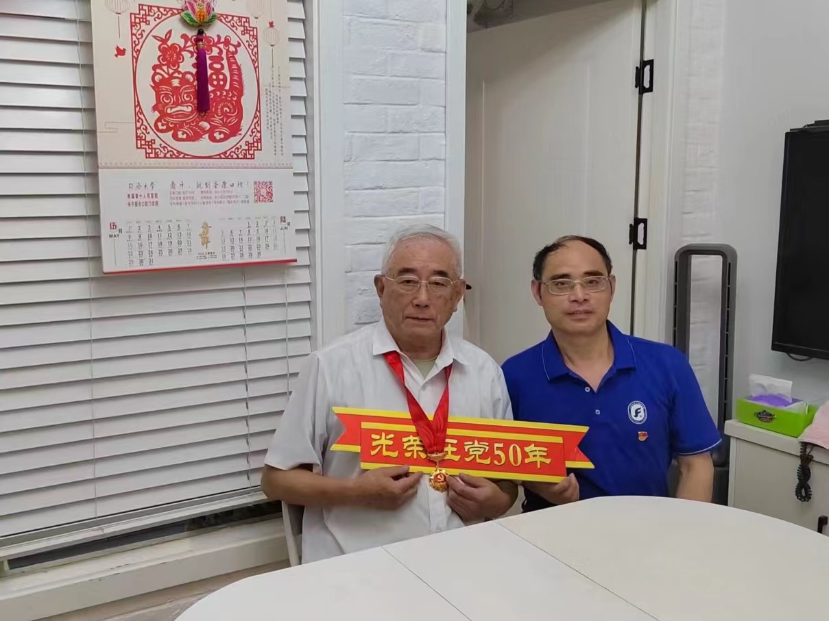 戴朝晖老师和张建琴老师来到老党员金贵荣家中,与他亲切交谈,表达了诚挚的祝贺和崇高的敬意,感谢他为党的事业作出的贡献。捧着手中沉甸甸的奖章,党龄50年的老党员激动不已,感谢组织的关怀与牵挂,希望更多青年党员接续奋斗,为学院的高发展贡献更多的力量。