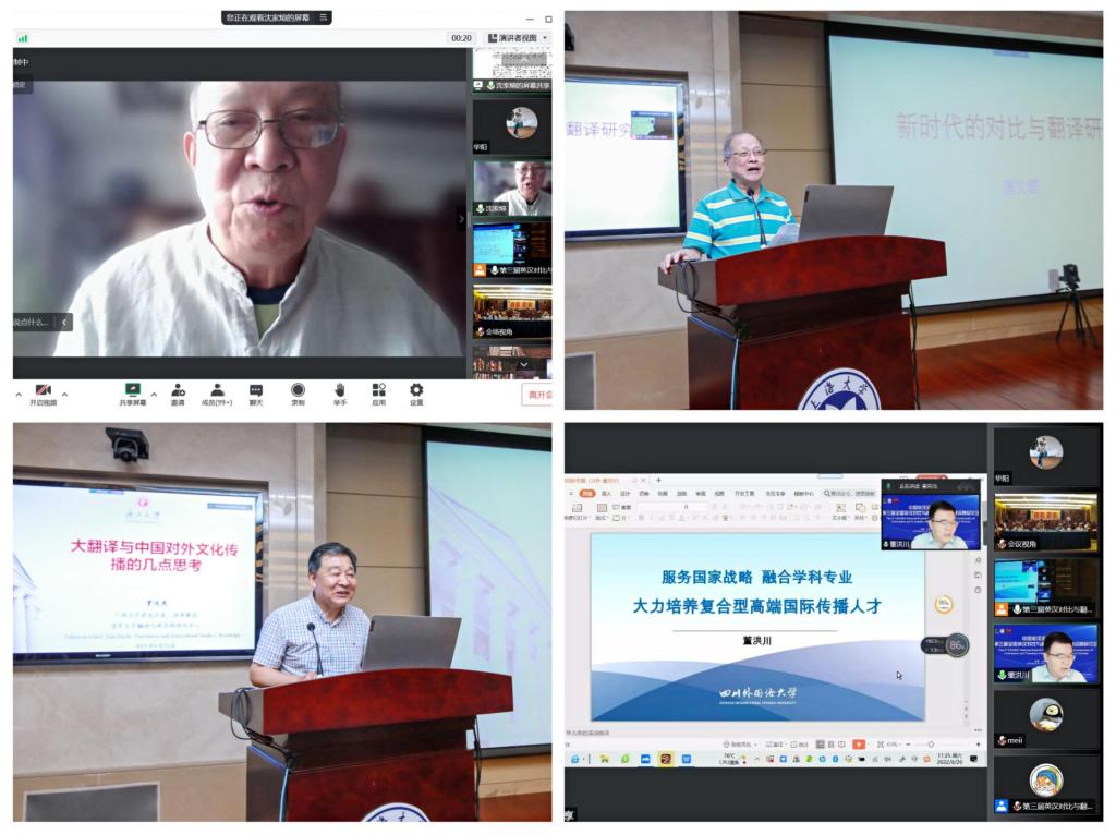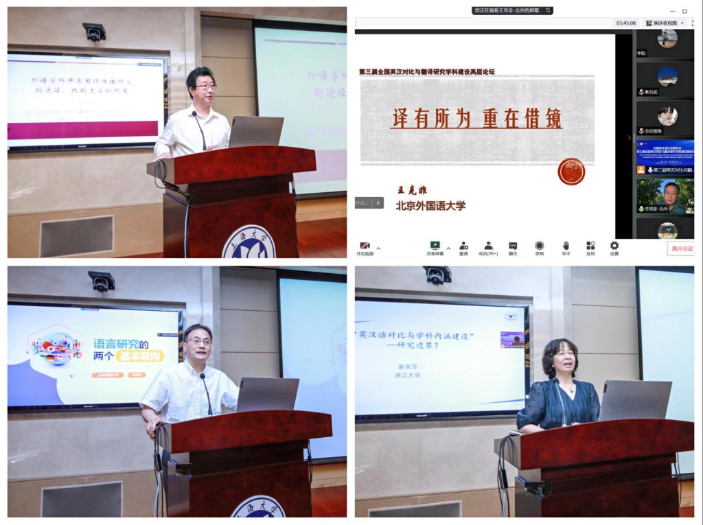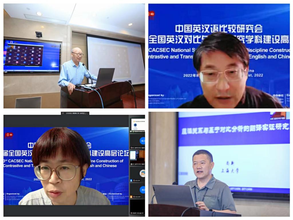 值纪念上海大学建校100周年之际,2022年8月19日至21日,中国英汉语比较研究会第三届全国英汉对比与翻译研究学科建设高层论坛在上海大学成功举办。本次论坛由中国英汉语比较研究会和上海大学主办,上海大学外国语学院承办,上海市外文学会、《上海翻译》编辑部协办。国家一级学会中国英汉语比较研究会会长罗选民、中国社科院文哲学部委员沈家煊、第七届国务院学位委员会外国语言文学学科评议组委员王克非、第八届国务院学位委员会外国语言文学学科评议组召集人查明建、教育部英语专业教指委委员董洪川、著名语言学家潘文国、李葆嘉、王寅等,资深翻译家方梦之、何刚强、左飚等名家学者,中国英汉语比较研究会领导班子集体等来自全国各高校的50位名家学者线下齐聚上海大学宝山校区,831人次专家学者线上参会或旁听,BiliBili直播平台累计在线收看人次超3600人,共同探索新时代国际传播形势下我国英汉对比与翻译研究的新发展。