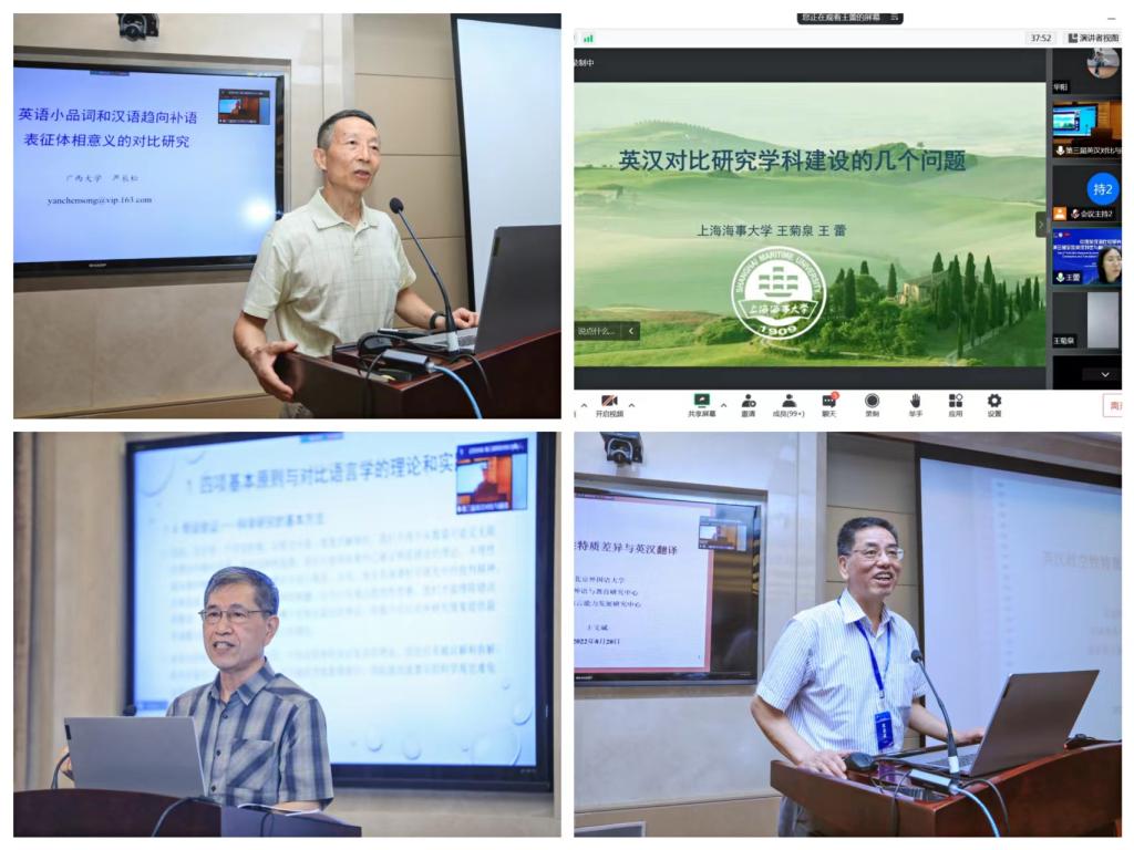 8月21日上午进行了7场主旨报告。广西大学君武特聘教授、中国英汉语比较研究会英汉语言对比学科委员会主任严辰松教授分享了英汉小品词和汉语趋向补语表征体相意义的对比研究成果,他提出英语小品词和汉语趋向补语都可表达体相意义,英汉这两个形式类在构建各自语言词汇体方面的贡献值得深入研究。中国英汉语比较研究会顾问、上海海事大学王菊泉教授的报告首先追溯了学科建设高层论坛的历史缘起,并具体从三个层面讨论了英汉对比研究的学科建设问题,认为英汉对比研究至今缺乏一个比较可靠的对比基础,其次英汉对比研究应充分开发并利用翻译语料库,今后的研究也应加强英汉对比与翻译研究的互补性。上海外国语大学语言研究院名誉院长许余龙教授结合国外对比语言学著作,讨论了与英汉对比学科建设密切相关的对比语言学的理论与实践问题。中国外语与教育研究中心主任、中国英汉语比较研究会外语教育技术专业委员会会长王文斌教授的报告从英汉语存在强与弱的时空性特质差异着手,即英语强调对时间的表达,而汉语则偏爱对物象和事象的表述,并探讨在英汉翻译过程中如何把握此种差异。章黄学派传人、语言科技新思维倡导者李葆嘉教授做了题为“英国汉语文法学家苏谋斯(1863)的句子成分分析法及其溯源”的报告,李教授从史料出发,仔细梳理了汉语句子成分的细化分析法和英语句子的成分分析法的历史,经文献考查证明了马提阿努斯在5世纪最早明确提出句子的主-谓二分分析法。中国英汉语比较研究会中西语言哲学专业委员会原会长王寅教授基于新文科视野探讨体认翻译学的内核,指出在当今大力提倡“新文科”教育理念的背景下,翻译学与语言学应加强合作,携手共建“体认翻译学”。广东外语外贸大学高级翻译学院李明教授以“梁漱溟《中国文化要义》英译”为例阐释了信息布局对于句子、段落及语篇构建的决定性作用。