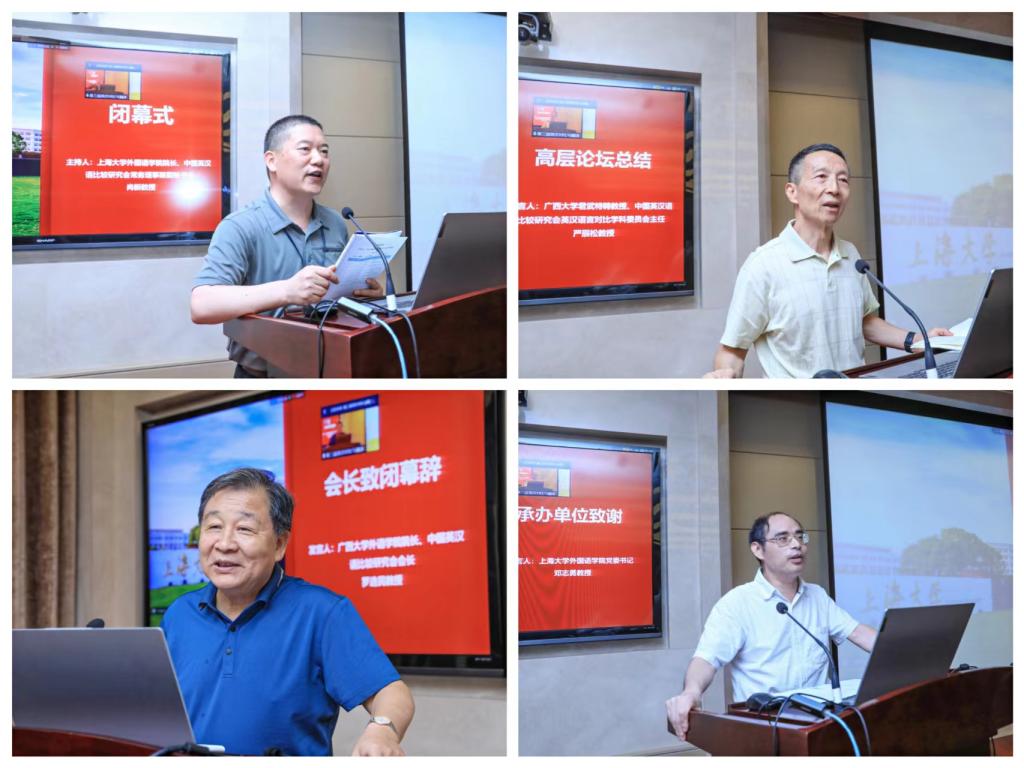 论坛闭幕式由尚新教授主持。严辰松教授做总结发言,严教授高度评价了论坛的组织与筹备工作,本次论坛既有宏观、高站位的洞见,又有接地气、深刻独到的观点,学术含金量高。罗选民会长致闭幕辞,罗会长对上海大学领导和各相关单位对论坛举办给予的大力支持表示感谢,热烈祝贺上海大学建校100周年,高度评价了上海大学外国语学院的精心组织。针对学会今后的学科建设和学术研究,罗会长提出了几点殷切期望,指出未来英汉对比与翻译研究应从理论走向实践,打通国际传播的双向渠道,特别要注重话语修辞与国际接轨,保持文化自信与文化自觉。最后,上海大学外国语学院党委书记邓志勇教授代表承办单位致谢,感谢中国英汉语比较研究会给予此次办会机会,他指出本次论坛是纪念上海大学建校100周年的重要活动之一,论坛中19位专家的主旨报告、8场线下、线上分论坛报告内涵丰富、启迪思维。本次论坛在热烈的掌声中圆满落幕。论坛结束后,与会代表前往上海大学校史纪念馆、钱伟长纪念馆参观。