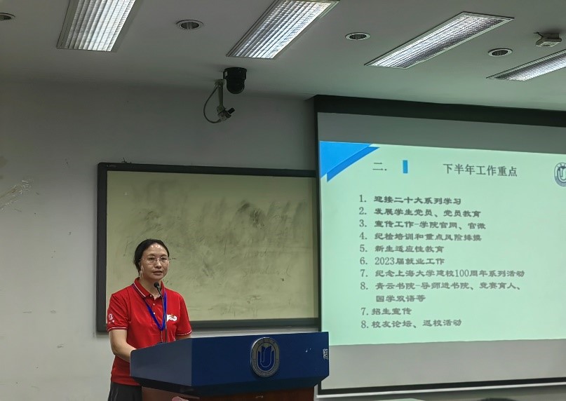 学院党委副书记、副院长贾小琴对上半年学生工作的开展情况进行回顾:封校期间,学院领导前后三次深入宿舍慰问学生,发放物资,保障学生生活质量;就业方面,通过访企拓岗、学导联动等多重举措,2022届毕业生就业率达到94.42%;受疫情影响,今年的招生宣传工作以线上为主。下半年,我们将围绕纪念上海大学建校100周年和喜迎党的二十大胜利召开开展相关活动,同时继续推进思想政治教育、学生党员发展、2023届毕业生就业工作的筹备,以及青云书院项目。