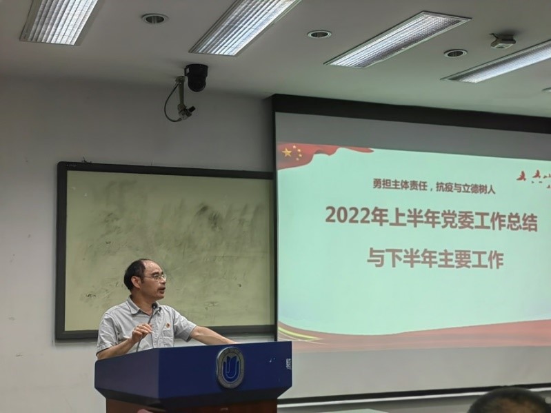 首先,学院党委书记邓志勇总结了党委上半年工作,并就下半年主要工作做出部署,提出六项要求:一是要全面落实主体责任制,抓好“一岗双责”、“四责协同”;二是要认真落实中央及市委重大部署,迎接党的二十大胜利召开;三是要压实疫情防控责任,确保师生健康安全;四是要夯实“三全”育人基础,扎实推进落实立德树人;五是要发挥群团组织作用,开展凝心聚力工程;六是要提高政治站位,以高度的责任感完成相关政治任务。