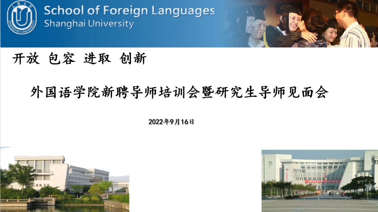 为部署新学年的研究生教研工作,迎接2022级研究生新同学,切实做好新生入学教育工作,帮助新生尽快熟悉学校相关管理政策和学院培养环节的要求与特色,9月16日下午,外国语学院于线上召开了新聘研究生导师培训会暨研究生导师见面会。学院领导班子、学科方向负责人、部分研究生导师、全体新聘导师(包括校外导师)、教学秘书和2022级研究生新生参加了会议。会议由学院分管研究生教学工作的副院长唐青叶教授主持。
