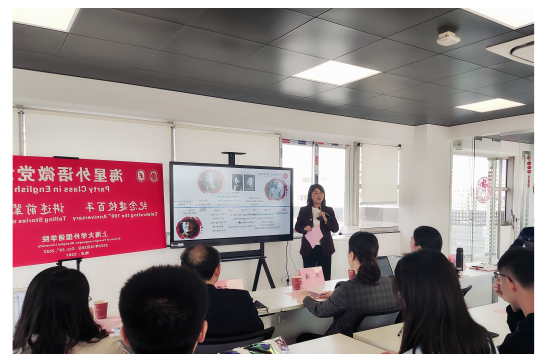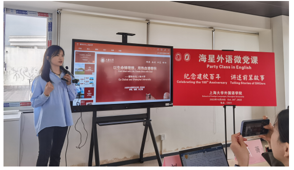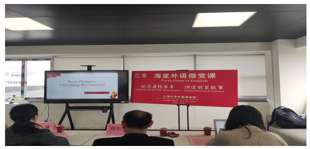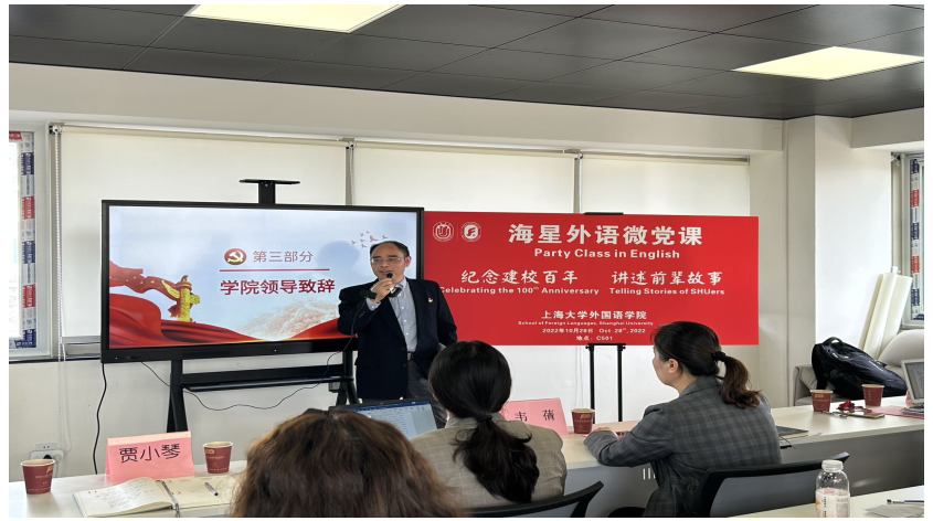 10月28日下午,外国语学院在宝山校区C501会议室成功举办了以“纪念建校百年·讲述前辈故事”为主题的外语微党课活动。外国语学院党委书记邓志勇,党委副书记、副院长贾小琴,英语系党总支书记张建琴,英语系第一教工党支部书记袁丽梅,第二教工党支部书记于梅欣,第三教工支部书记花亮,研究生党总支委员曹若兰和研究生党支部代表参加了此次活动,校保密处主任韦倩老师和校组织部刘璐老师受邀观摩了本次微党课。活动由外国语学院2022级专业型研究生第二党支部书记杜天赐主持。