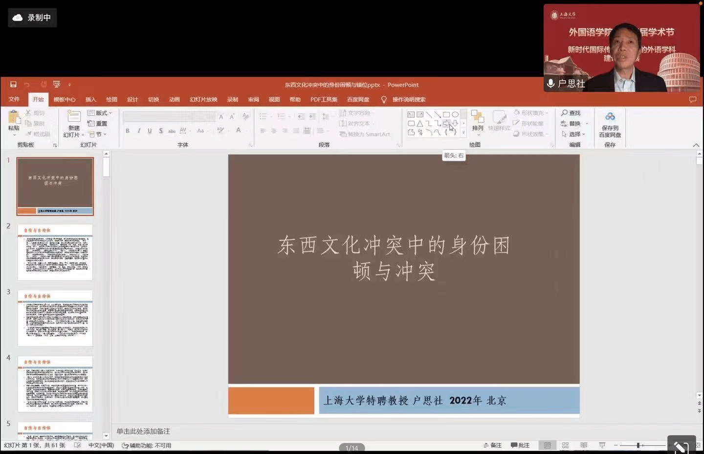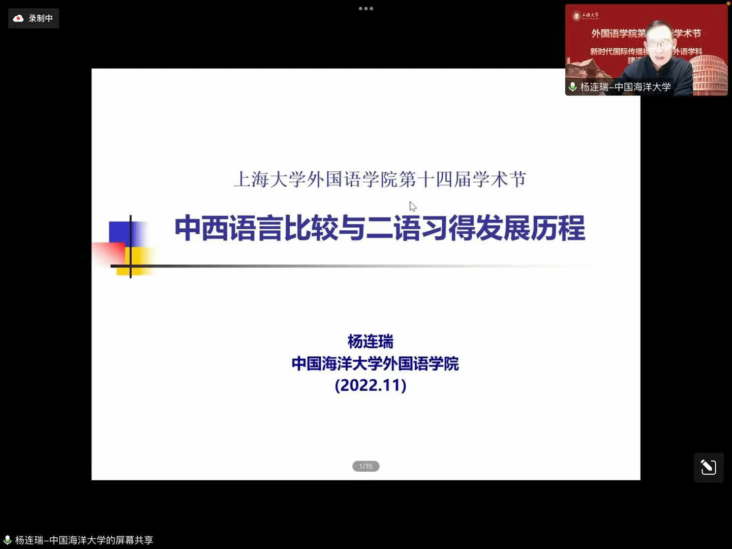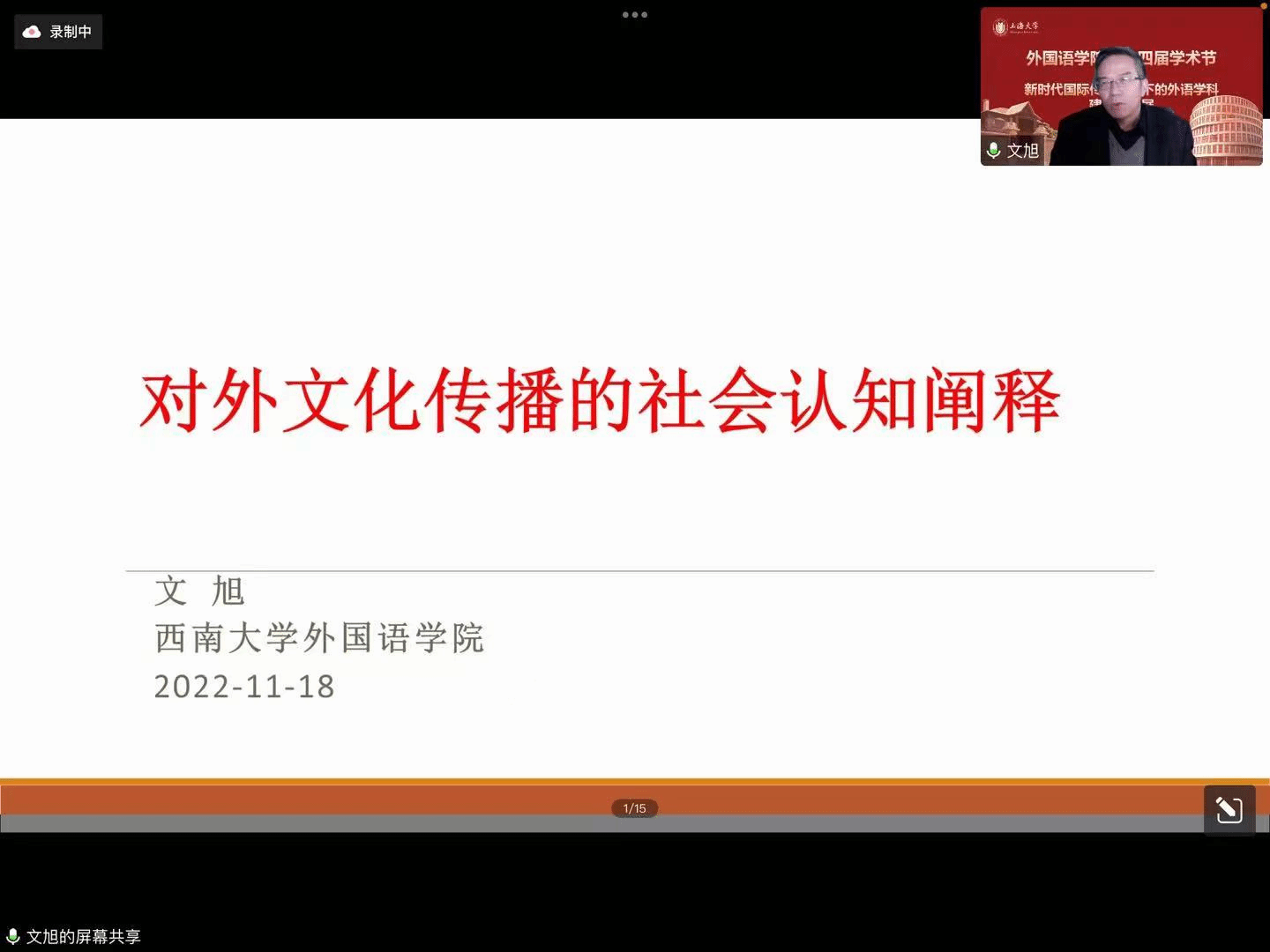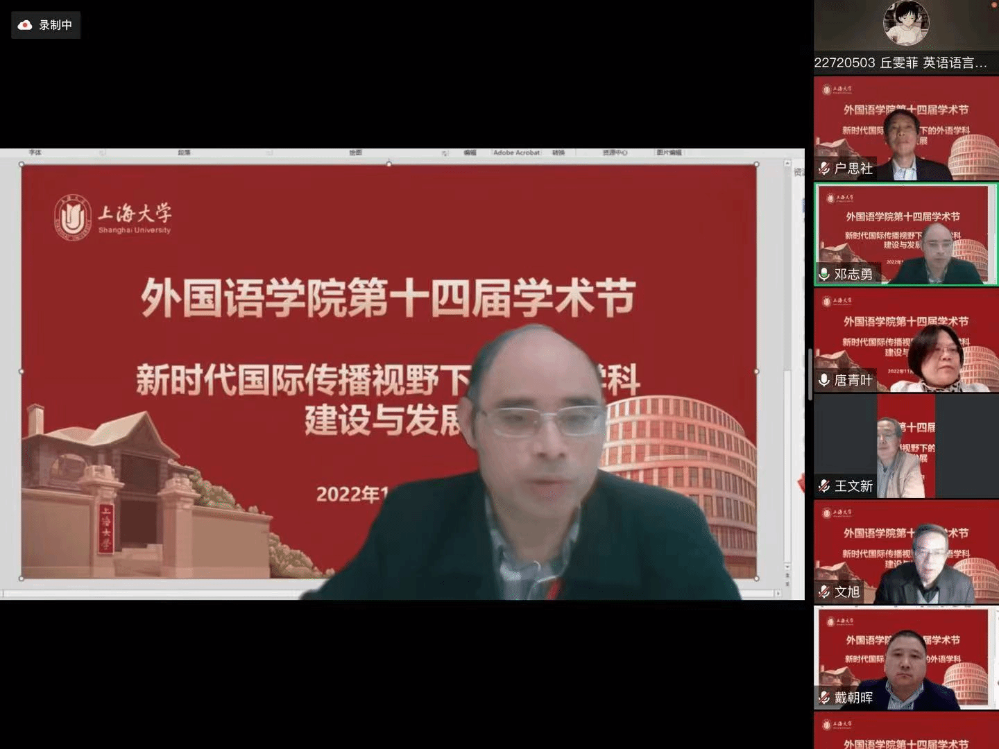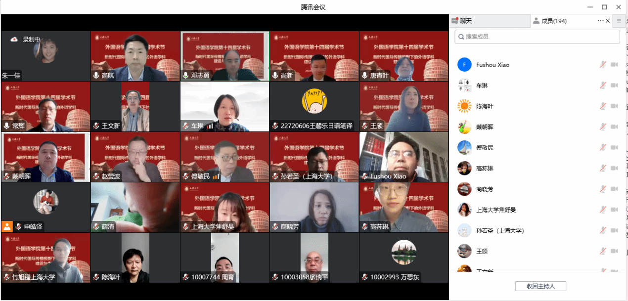 在喜庆党的二十大胜利召开、上海大学建校100周年,以及对接“中华文化走出去”“讲好中国故事”的国家战略需求背景下,外国语学院积极作为,竭力为国家战略发展、上海市城市软实力提升和以上海为核心的长三角协同融合做贡献,举办以“新时代国际传播视野下的外语学科建设与发展”为主题的系列学术活动暨外国语学院第十四届学术节。11月18日下午以线上形式举行学术节开幕式,主题为“新时代国际传播视野下的中西语言文化比较研究”。本次开幕式有六位专家做主旨报告,外国语学院副院长唐青叶和戴朝晖担任主持,约200名校内外师生参加。