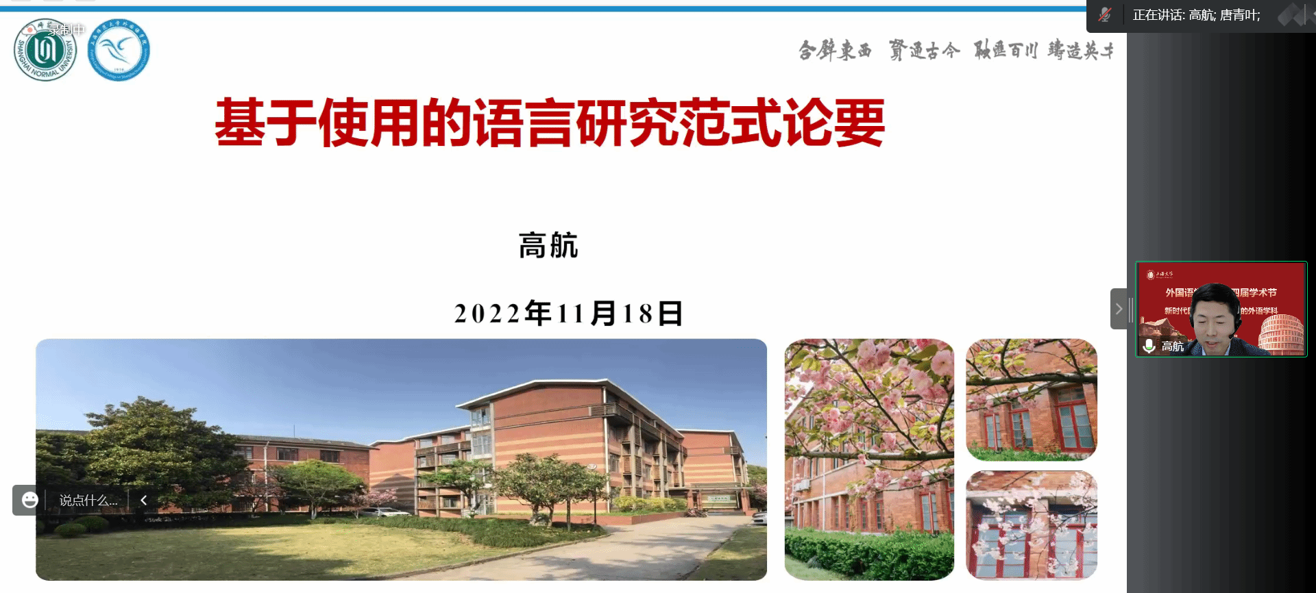 第三位主讲人是上海师范大学外国语学院院长高航教授。他详细介绍了“基于使用的语言研究范式论要”。他从语法从哪里来、语言是什么引出了对语言使用研究的回顾,其中既有在词、形态、句法、语用、语篇层面的思考,又有对二语习得以及外语教学方面的启示。