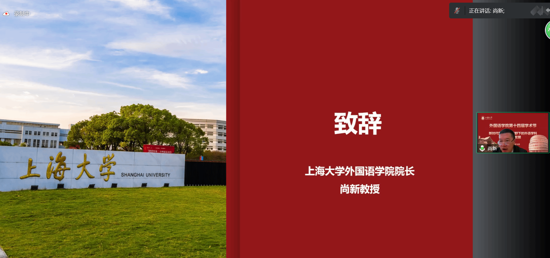 开幕式伊始,外国语学院院长尚新教授致辞。尚新院长首先对各位专家的到来表示热烈欢迎和诚挚的感谢,向与会人员介绍了外国语学院的历史、学术成果和未来规划,并预祝本次学术节顺利举办。