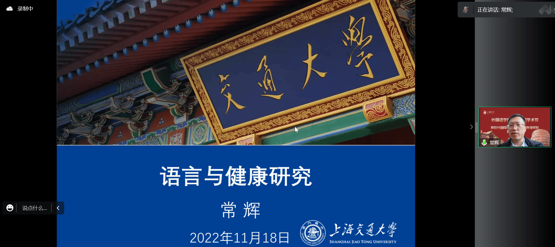 第二位主讲人是上海交通大学外国语学院院长常辉教授。他以“语言与健康研究”为题,从人类语言健康所存在的问题、当前领域内的相关研究以及失语症三个方面切入,通过各种数据例证和案例剖析,向大家阐明了语言与健康关联的密切性,以及语言与健康研究在科学研究、人才培养和社会服务等方面的巨大价值。