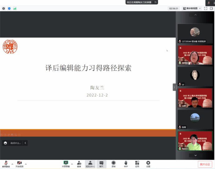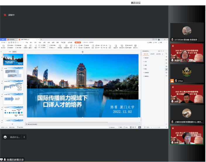12月2日下午,上海大学外国语学院第十四届学术节MTI专场讲座“新时代国际传播视野下的翻译技术应用”于线上顺利举行。主讲人包括上海外国语大学高级翻译学院柴明颎教授、北京语言大学高明乐教授、厦门大学陈菁教授、复旦大学陶友兰教授以及上海科技创新资源数据中心数据智能研究院院长徐鹏景先生和技术负责人樊宇航先生。讲座由外国语学院副院长唐青叶教授主持,校内外师生一百余人参加了本次专场活动。